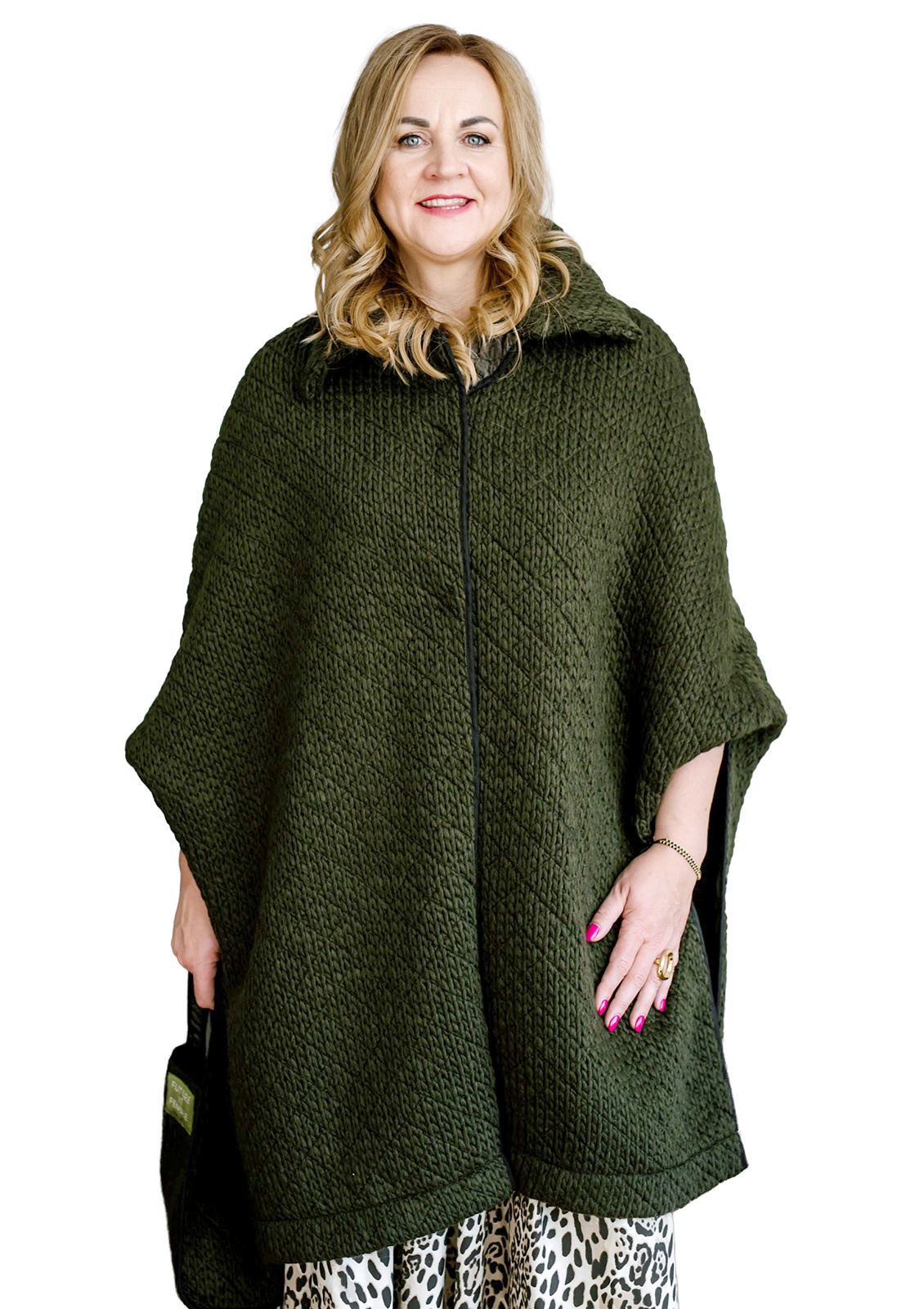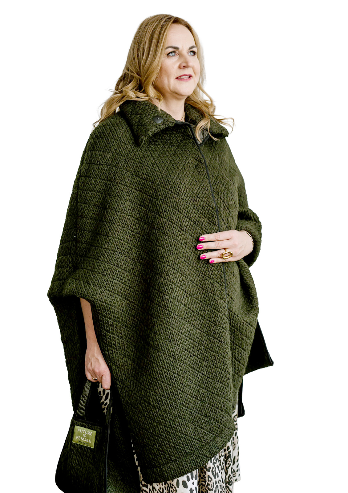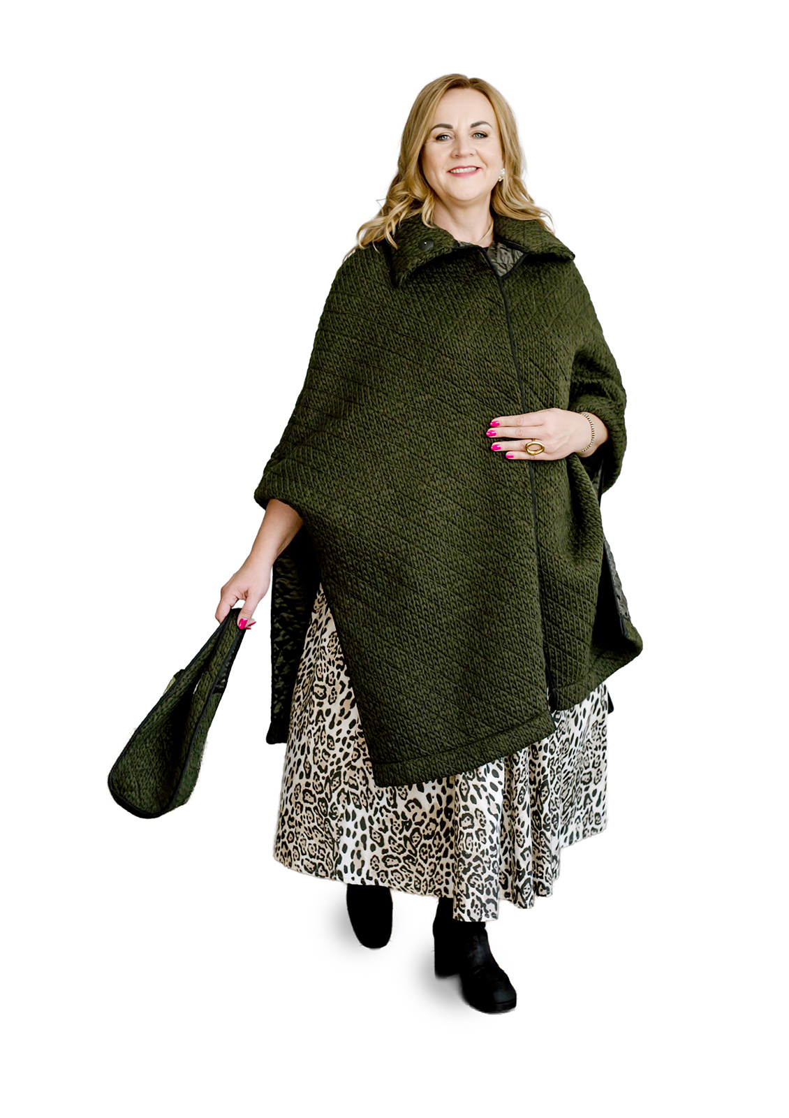 This quilted fabric coat in a poncho style is designed to highlight personality while providing comfort and confidence. The relaxed silhouette, soft material, and practical raised collar combine functionality with aesthetics. The dark green shade – deep yet natural – gives the coat a sophisticated character, making it suitable to wear with trousers or a dress, or as a standout piece during transitional seasons.