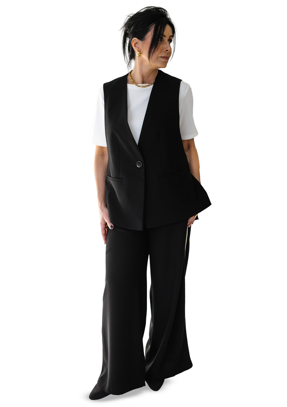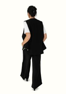 Elegant black vest with an extended silhouette, crafted from high-quality suiting fabric. Its minimalist cut and clean lines create a structured, refined look, making it a versatile wardrobe piece. Perfect for pairing with blouses, dresses, or trousers, allowing for both formal and everyday outfit combinations.