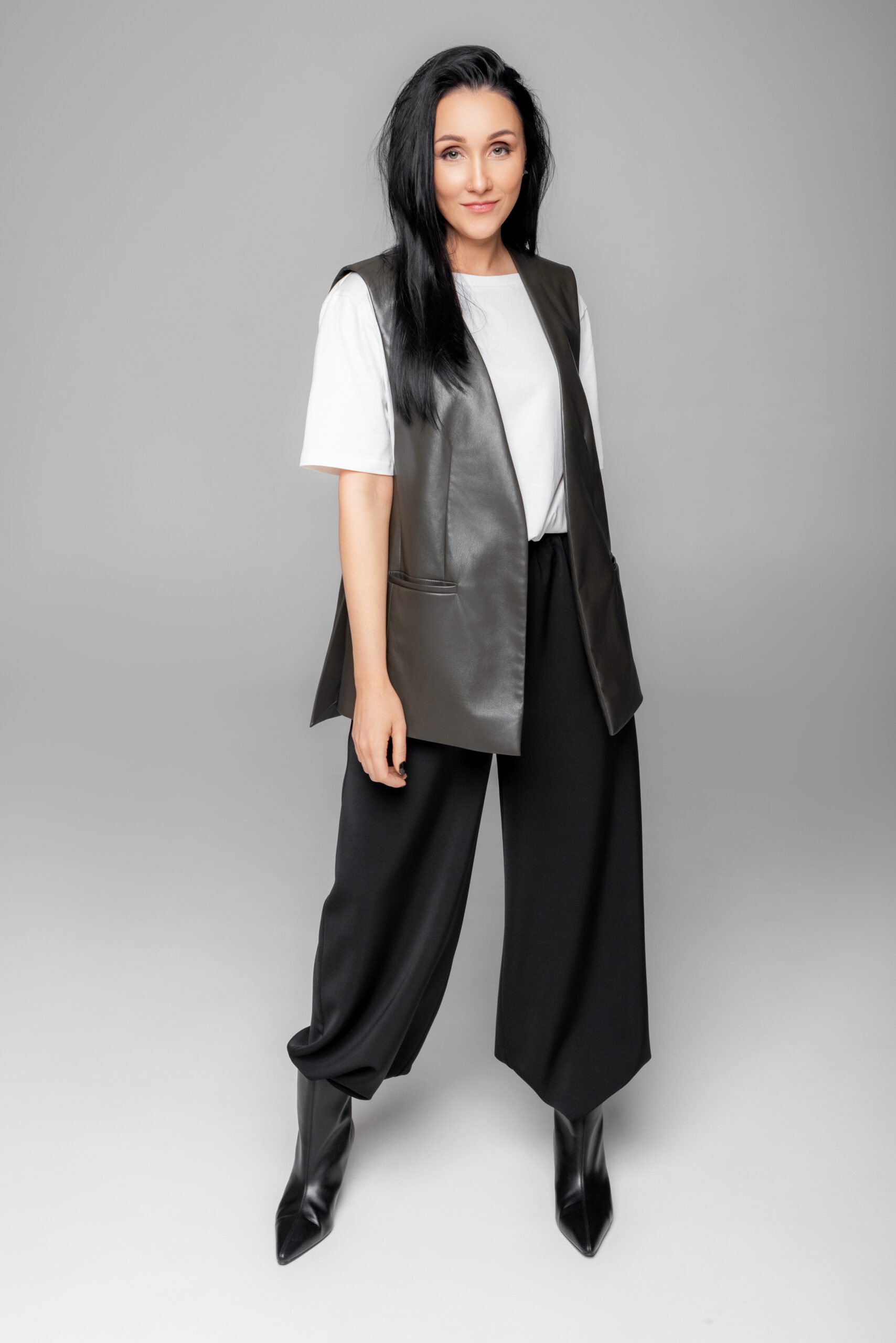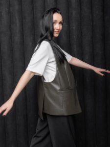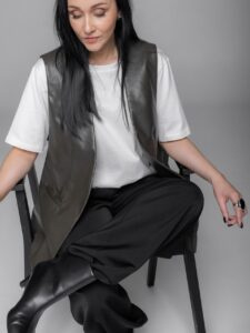 Laikmetīgs siluets un daudzpusīga elegance. Šī ādas imitācijas veste ar vienkāršu, bet izteiksmīgu piegriezumu veido strukturētu, vienlaikus nepiespiestu tēlu. Taisnais siluets vizuāli pagarina figūru, savukārt gludais materiāls piešķir koptēlam mūsdienīgu akcentu.
