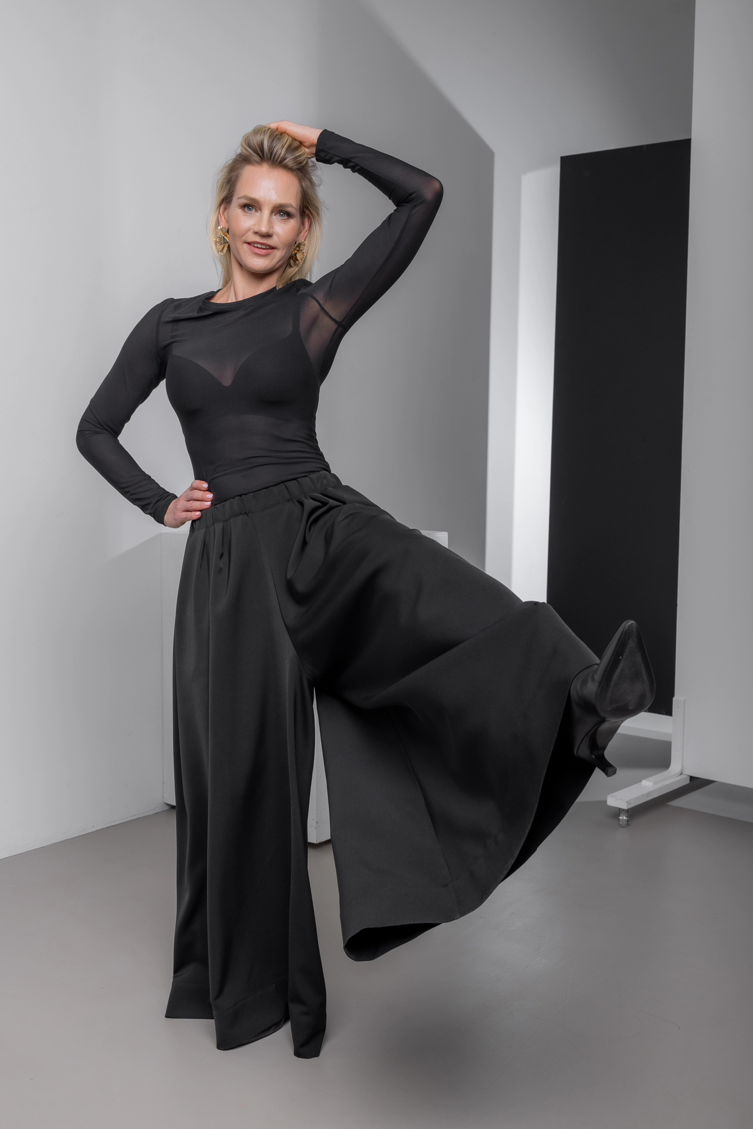 Brīvība kustībā un pārliecība siluetā. Šīs ekstra platās bikses ar izteikti plūstošu kritumu veido spēcīgu, bet vieglu tēlu. Augstā jostasvieta un tīrais piegriezums vizuāli pagarina figūru.