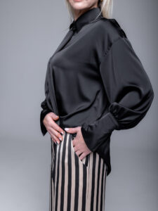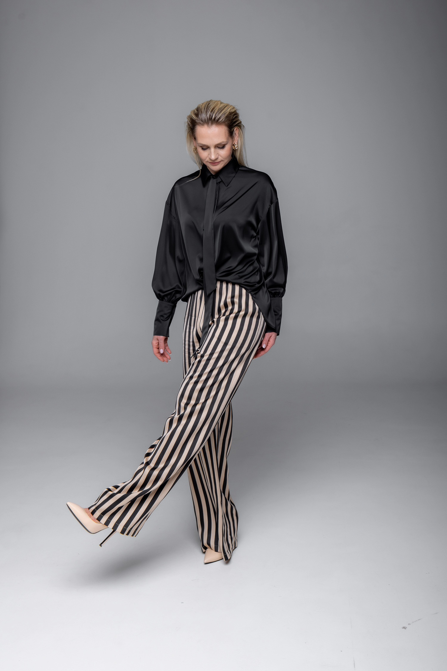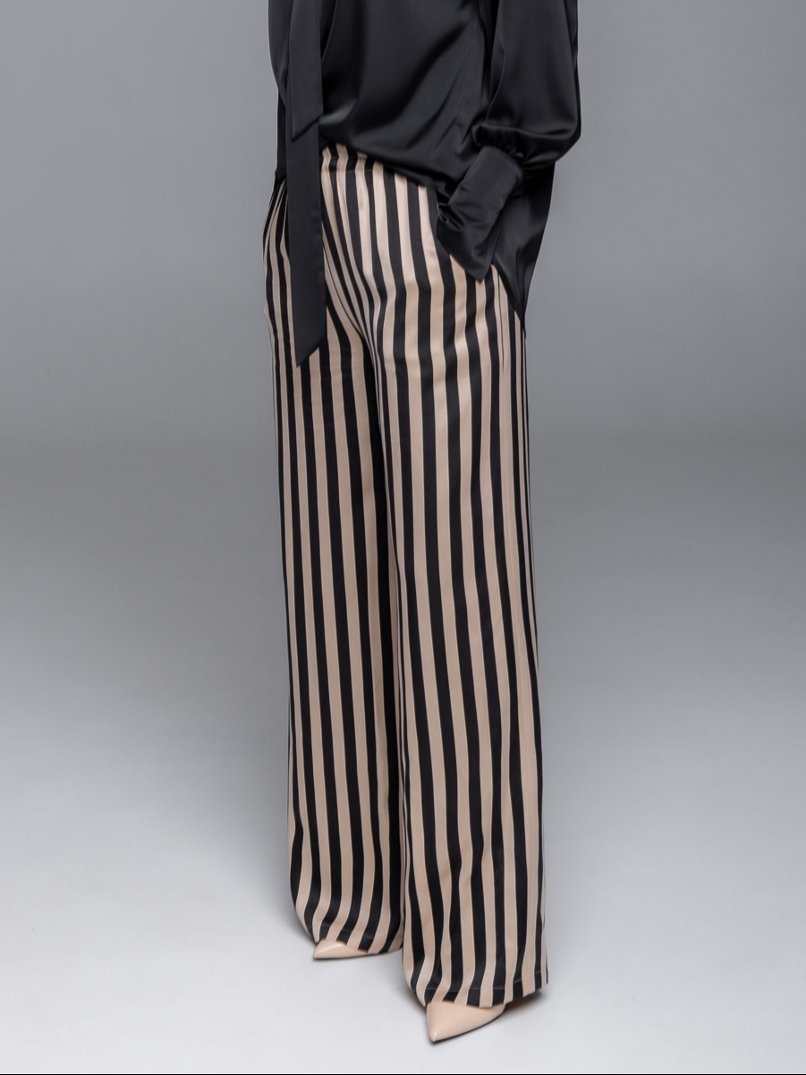 Gludais satīna audums piešķir biksēm izsmalcinātu spīdumu un patīkamu kritumu, savukārt svītrainais raksts rada ritmu un grafisku akcentu. Piemērotas gan ikdienas stilam, gan izsmalcinātākām kombinācijām.
