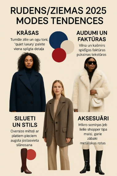 Šosezon īpaši populāri būs tumšie zilie un ogu toņi, kas sniegs dziļumu un eleganci mēteļos un aksesuāros. Vienlaikus turpina valdīt arī “quiet luxury” palete ar krēmkrāsas, bēšiem un pelēkiem toņiem, kas simbolizē nevainojamu vienkāršību un izsmalcinātību. Tomēr modes dizaineri iesaka nebaidīties pievienot vienu spilgtu detaļu – piemēram, sarkanu šalli vai košu somiņu, kas uzreiz piešķir tēlam personību.